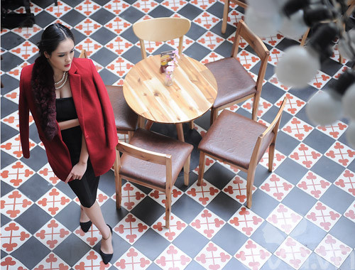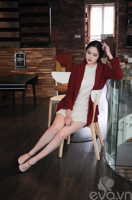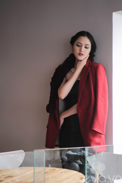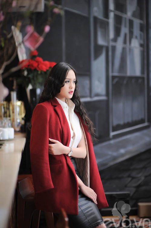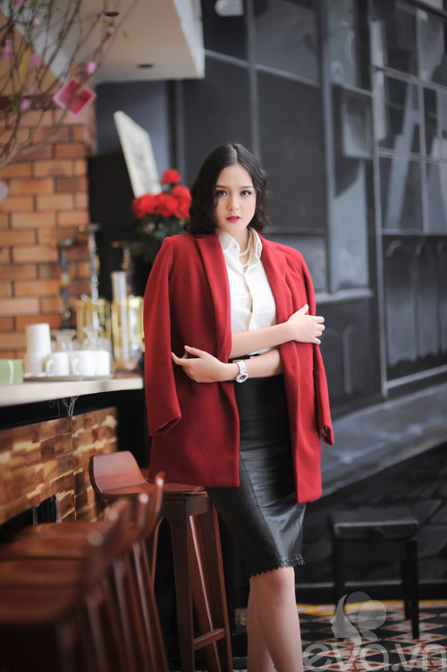 Màu đỏ bắt mắt của áo khoác và đen-trắng của trang phục bên trong cân bằng cùng với nhau tạo nên tổng thể hài hòa vừa ấn tượng, quyến rũ vừa lịch lãm, sang trọng.