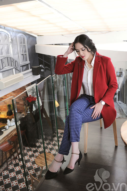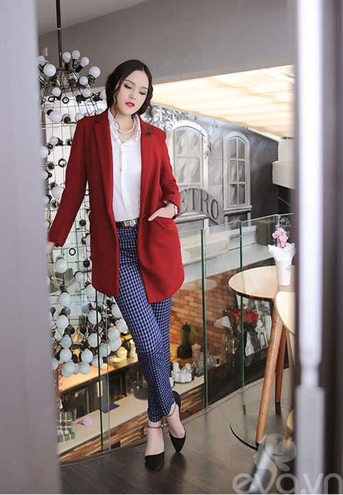 Ngày đầu xuân se lạnh hãy giữ ấm mình với chiếc áo khoác blazer đỏ dáng dài phủ ngoài cặp đôi sơ mi trắng cùng quần kẻ xắn gấu để có trang phục hoàn hảo chốn văn phòng.