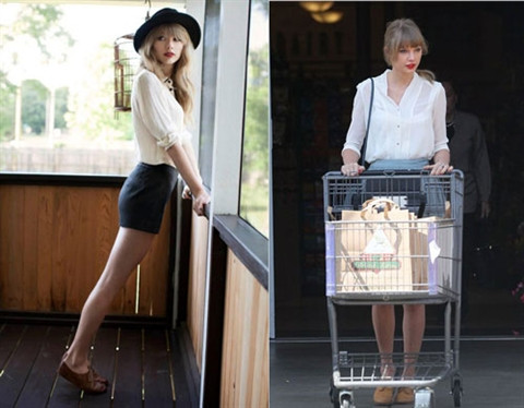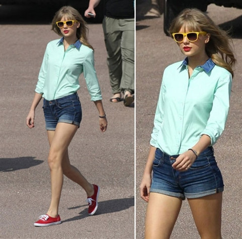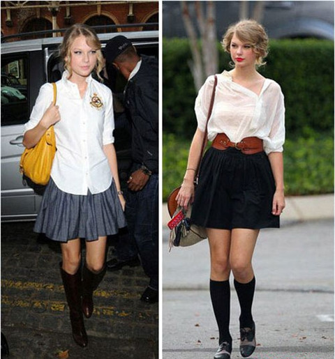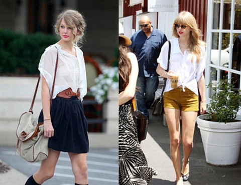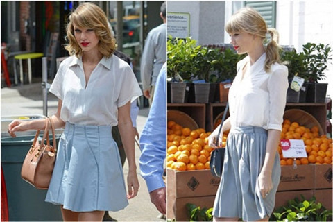 Không cầu kì, chỉ với áo sơ mi trắng và chân váy xanh như Taylor Swift, bạn đã có ngay một trang phục thanh lịch và tươi sáng để đi làm, đi chơi.
