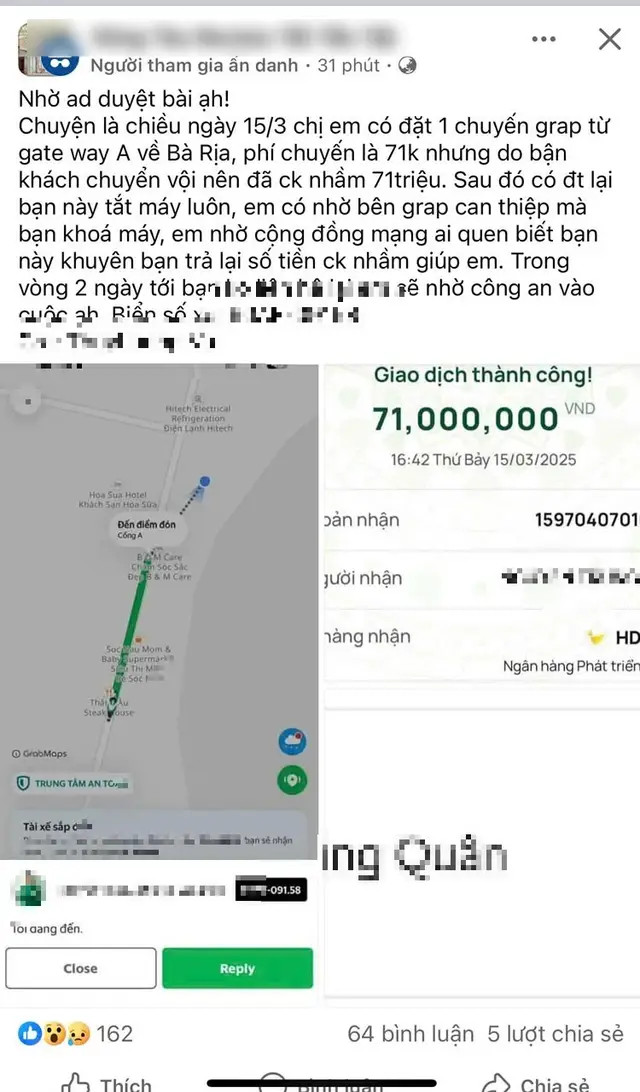 Hai ngày trôi qua mà không có phản hồi, chị L. quyết định đăng thông tin của tài xế lên mạng xã hội, nhờ cộng đồng hỗ trợ tìm kiếm, đồng thời kêu gọi nếu ai quen biết anh này thì khuyên anh sớm hoàn trả số tiền.