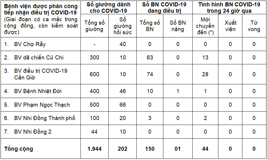 Được biết, BV Dã chiến Củ Chi nhận từ các Khu cách ly Quận Tân Bình (4), Khu cách ly Quận 8 (1), Khu cách ly TP Thủ Đức (5), Khu cách ly Quận Bình Thạnh (2), Bệnh viện Chợ Rẫy (1); BV Điều trị COVID-19 Cần Giờ nhận từ Khu cách ly và bệnh viện: Tân Bình (1), Gò Vấp (17), Bình Thạnh (5), Quận 5 (1), Quận 10 (2), Quận 1 (1), TP Thủ Đức (1); BV Bệnh Nhiệt Đới tiếp nhận 1 người bệnh tự đến; BV Nhi đồng Thành phố nhận từ Khu cách ly của Bình Thạnh (2).