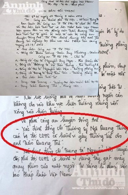 Nội dung biên bản đối thoại giữa Công an thành phố Hà Nội và Báo Tuổi Trẻ có đoạn thừa nhận cán bộ cảnh sát hình sự của Công an huyện Đông Anh đã có hành vi gây thương tích cho phóng viên Quang Thế. - (Ảnh: An ninh Thủ đô)