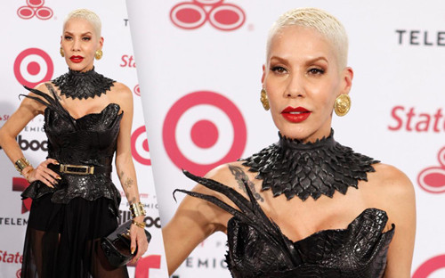 Ca sĩ Ivy Queen cá tính với tóc gần cạo trọc và trang phục da, màu đen tuyền.