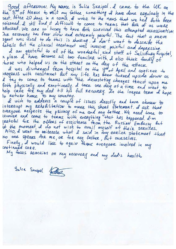 Cũng theo Yulia, hai cha con bà đã “may mắn sống sót sau khi bị ám sát”, và đã trải qua quá trình hồi phục “đau đớn, đầy tuyệt vọng”. Sau khi sức khoẻ hồi phục hoàn toàn, Yulia mong muốn có thể trở về Nga.