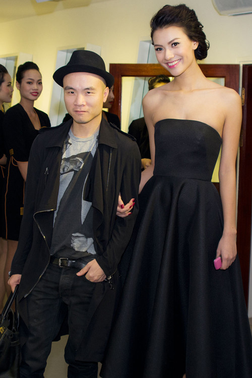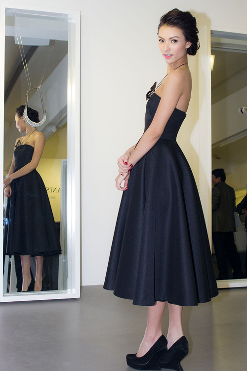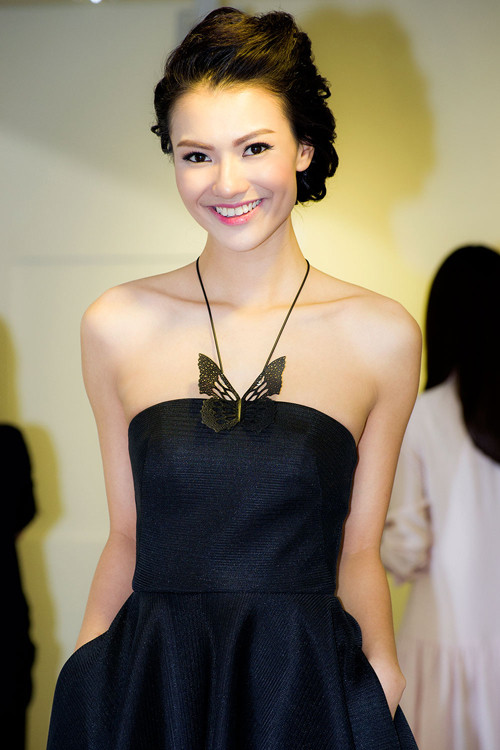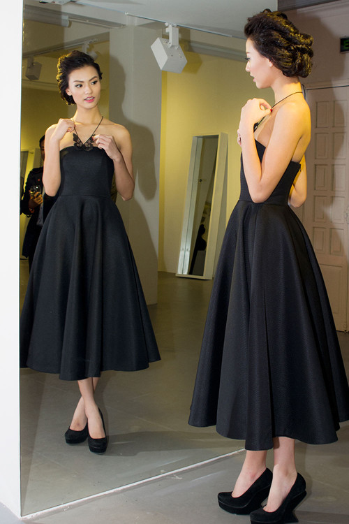 TPO - Nữ người mẫu xuất hiện dịu dàng và xinh đẹp trong bộ váy quây màu đen yêu kiều của nhà thiết kế Đỗ Mạnh Cường, để lộ vai thon và hình xăm ấn tượng.