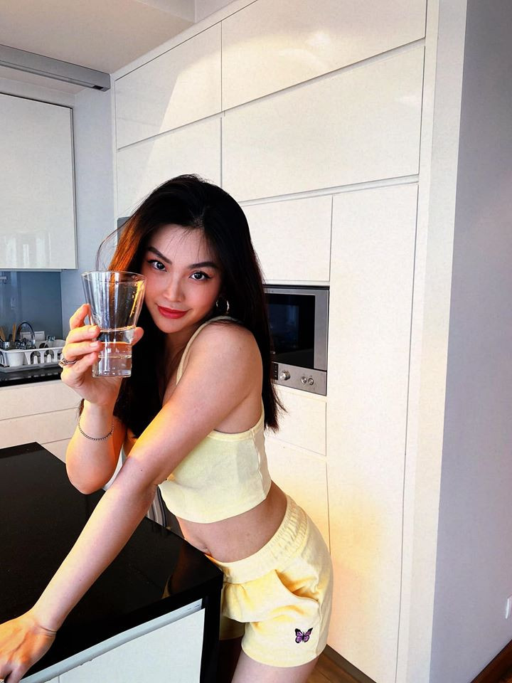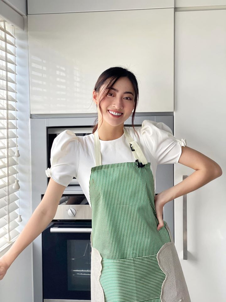 Hoa hậu Lương Thuỳ Linh giản dị nhưng vẫn rạng rỡ và xinh đẹp khi vào bếp.