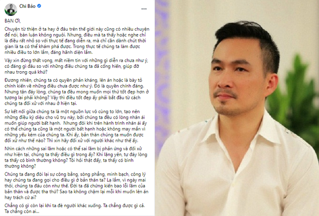 Sau đó, Chi Bảo tiếp tục đăng tải dòng trạng thái ngắn gọn: “Hãy thử 1 năm dừng làm từ thiện xem trong lòng thấy thế nào?”. Nam diễn viên giải thích thêm: “Dù mình có làm hay không làm từ thiện, cũng không ảnh hưởng hay làm thay đổi được thế giới này. Đó là chưa nói đến có những việc thà không làm còn tốt hơn là làm. Vì làm từ thiện mà tạo nên sự tranh cãi, nghi ngờ, thì tốt nhất nên dừng lại, không phải vì mình không trung thực không mình bạch, mà để giúp người khác đừng tạo thêm nghiệp chướng vì lòng nghi ngờ, phán xét, đó chẳng phải cũng là việc làm từ thiện hay sao, người ta gọi là có đức. Tức dằn lòng mình lại để tạo điều tốt hơn cho người khác. Nếu mình vẫn muốn làm điều mình cho là đúng, mặc thiên hạ dậy sóng, thì cũng được, nhưng để làm gì? Bởi, thế giới này vẫn thế nếu không có ta! Đợi đến khi trời yên biển lặng, ta lại ra khơi có muộn gì?”.