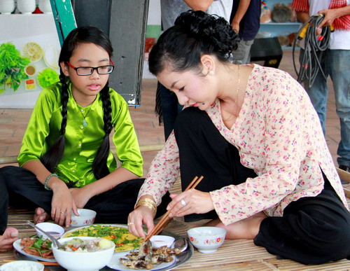 Nữ diễn viên đặc biệt yêu thích cô bé dân ca Phương Mỹ Chi và cho biết "chị Bảy" rất ngoan, dễ thương, được cả đoàn làm phim yêu mến. Những lúc giải lao trên phim trường, hai "mẹ con" còn tranh thủ chụp hình vui vẻ cùng nhau.