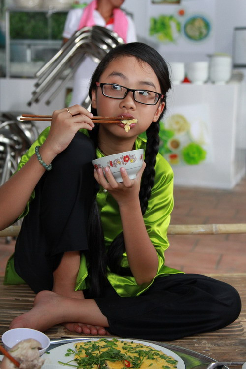 | Cô bé dân ca vẫn giản dị áo bà ba, tóc thắt bím hai bên. |