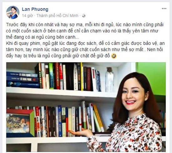 Diễn viên Lan Phương cho biết, dù đi làm hay ở nhà cô đều không thể thiếu được những cuốn sách. Cô viết: "Trước đây khi còn nhát và hay sợ ma, mỗi khi đi ngủ, lúc nào mình cũng phải có một cuốn sách ở bên cạnh để chỉ cần chạm vào nó là thấy yên tâm như thể đang có ai ngủ cùng bên cạnh... Khi đi quay phim, ngủ gật lúc đang đọc sách, để có cảm giác được bảo vệ, an tâm hơn, tay minh lúc nào cũng giữ chặt cuốn sách như thể sợ mất. Nên hồi đấy hay bị trêu là ngủ cũng phải giữ chặt để giữ đồ".