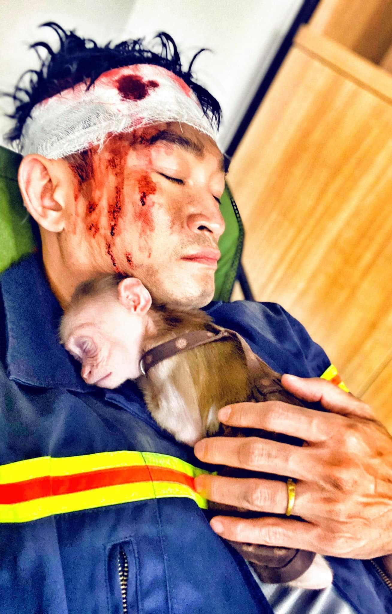 Trong phim “Lửa ấm”, NSƯT Trương Minh Quốc Thái vào vai Minh-đội trưởng đội cứu hỏa nên không tránh khỏi những cảnh mạo hiểm lao vào nơi nguy hiểm để cứu người. Hình ảnh hậu trường chia sẻ trên facebook khiến nhiều người nghĩ Quốc Thái bị trọng thương.