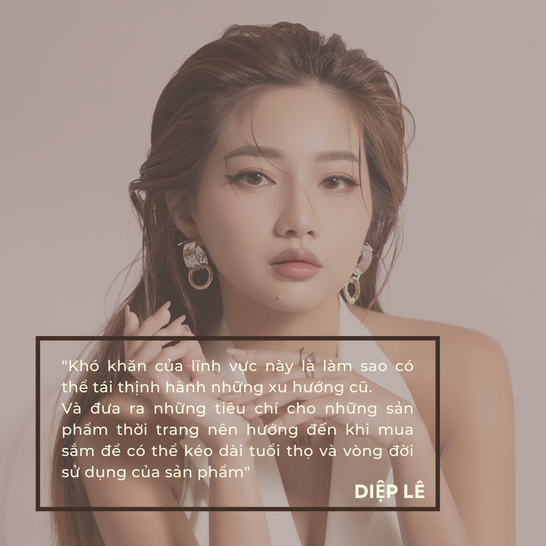 Khó khăn của lĩnh vực này là làm sao có thể tái thịnh hành những xu hướng cũ. Và đưa ra những tiêu chí cho những sản phẩm thời trang nên hướng đến khi mua sắm để có thể kéo dài tuổi thọ và vòng đời sử dụng của những sản phẩm này", Diệp Lê cho biết.