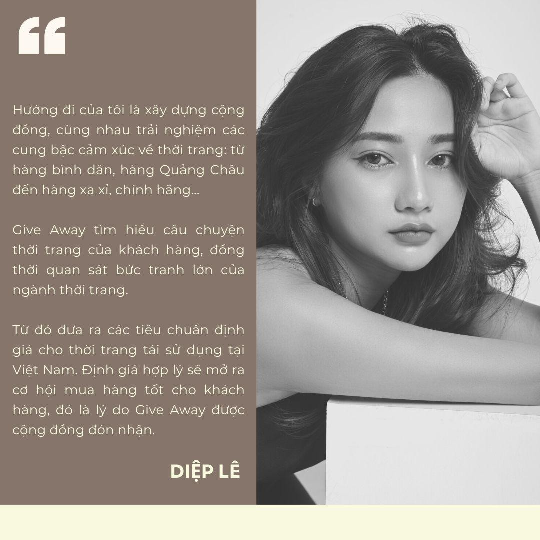Diệp Lê là người sáng lập và đồng điều hành mô hình tái sử dụng quần áo cũ Give Away từ năm 2014.
