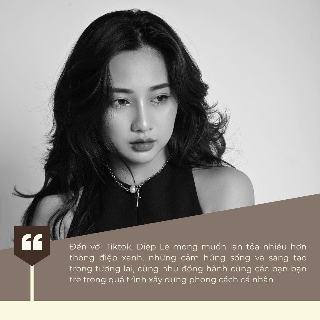 “Đến với TikTok, Diệp Lê mong muốn lan tỏa nhiều hơn thông điệp xanh, những cảm hứng sống và sáng tạo trong tương lai, cũng như đồng hành cùng các bạn bạn trẻ trong quá trình xây dựng phong cách cá nhân.”