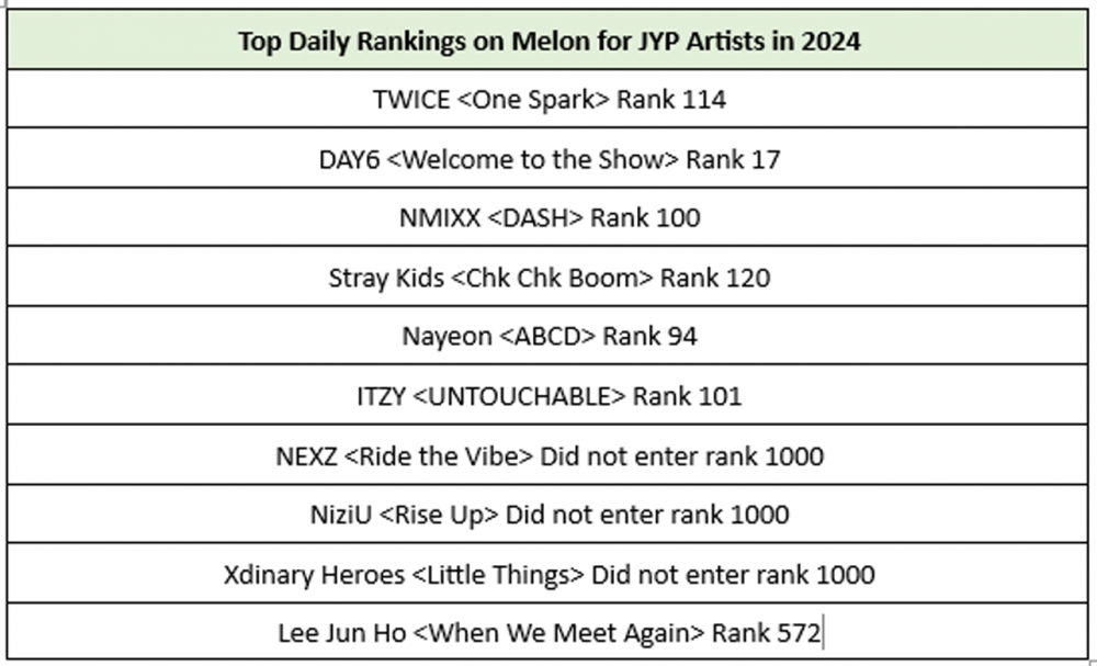 Được biết đến là nơi sản sinh ra một số nghệ sĩ thành công nhất K-pop, JYP thường duy trì sự hiện diện mạnh mẽ trên các bảng xếp hạng kỹ thuật số, nhưng các sản phẩm phát hành gần đây đã không đạt được đỉnh cao như mong đợi của hãng đĩa quyền lực.