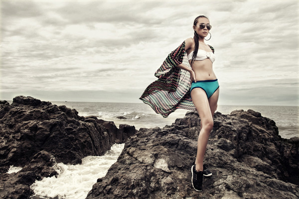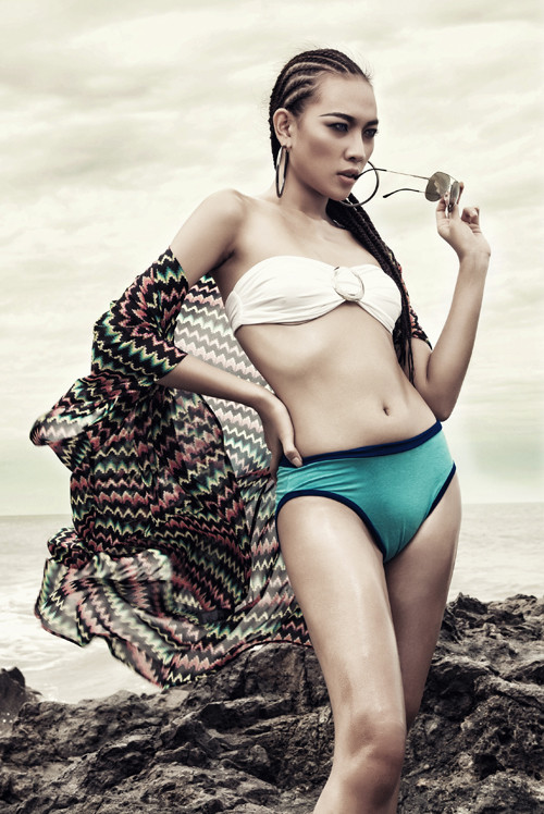Diệu Huyền có hình thể khá gầy nhưng vẫn tự tin diện áo tắm hai mảnh, làm mẫu ảnh. Dù đã dùng mút độn ngực, chân dài vẫn để lộ vòng một phẳng lỳ.