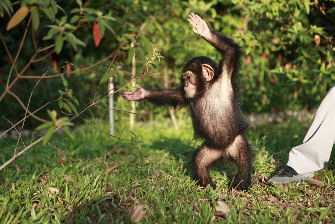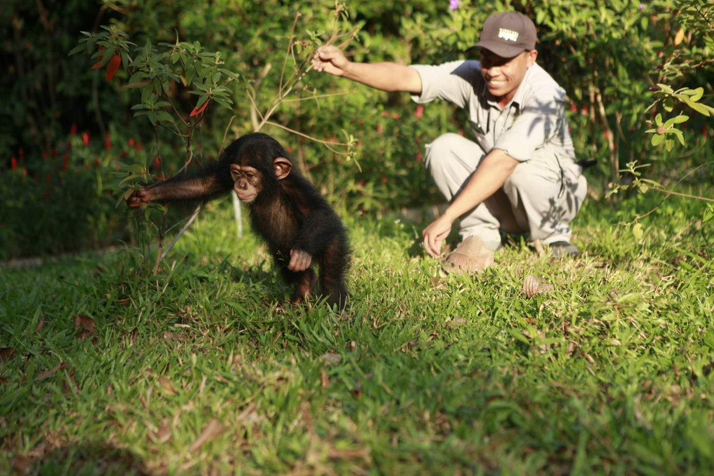 Mỗi buổi sáng, Phong, Nhường và Ngọc - ba nhân viên chăm sóc vừa kết thúc “thủ tục hàng ngày” trong khu vực chuồng trại hắc tinh tinh thì lại bị cô bé nghịch ngợm “níu chân”, giơ hai cánh tay lên, ánh mắt ươn ướt lóng lánh vòi vĩnh. Mọi người lắc đầu cười với nhau, ngầm hiểu “ngôi sao” Mây hoặc đòi đưa đi chơi, hoặc xin thêm đồ ăn vặt. “Vừa được ăn sáng với khẩu phần đầy đủ thức ăn, trái cây, sữa… nhưng Mây là vậy, bạn ấy thích tương tác và làm nũng với khách tham quan, nhân viên chăm sóc. Bạn hắc tinh tinh nhí này còn có bộ ảnh tập thể dục buổi sáng hút fan lắm” – Anh Bùi Phi Hoàng - trưởng Bộ phận chăm sóc động vật Vinpearl Safari Phú Quốc vui vẻ “kể tội” Mây.