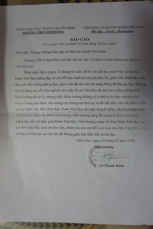 Cụ thể, chiều ngày 24/2, Phòng GD-ĐT huyện Yên Định đã cử cán bộ xuống Trường THCS xã Định Hòa để xác minh sự việc.