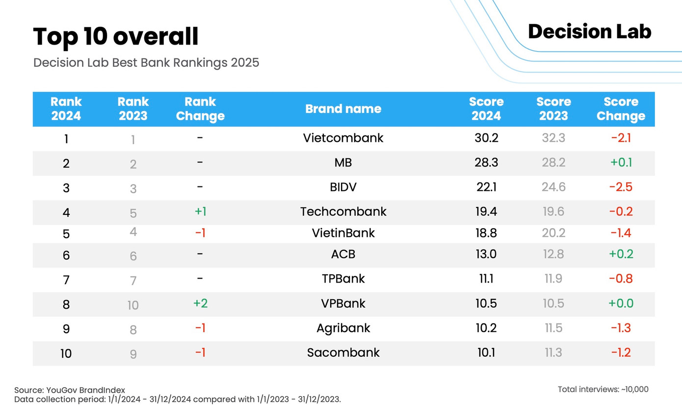 Bảng xếp hạng Ngân hàng Tốt nhất của Decision Lab hàng năm được xây dựng dựa trên chỉ số thương hiệu YouGov BrandIndex, một công cụ đo lường sức khỏe thương hiệu qua các yếu tố như Ấn tượng, Chất lượng, Giá trị, Hài lòng, Đề xuất và Danh tiếng. Các ngân hàng được xếp hạng dựa trên điểm số tổng hợp từ các yếu tố này, phản ánh mức độ nhận diện và tin tưởng của khách hàng vào ngân hàng. Bảng xếp hạng giúp đánh giá các ngân hàng hàng đầu và xu hướng cải thiện thương hiệu trong từng năm. Thông tin tham khảo thêm tại đây: https://www.decisionlab.co/best-bank-rankings-2025