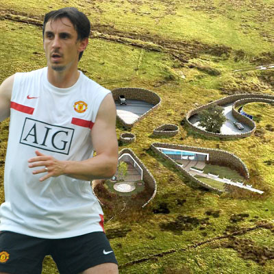 Cựu danh thủ MU Gary Neville từng gây xôn xao khi hé lộ thiết kế tổ ấm thân thiện với môi trường xây dưới lòng đất ở Bolton. Nhà của ông bố hai con được xây trên đồi, độc đáo trông như bông hoa 5 cánh.