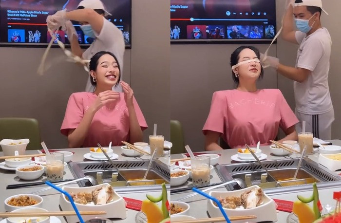 Trên trang cá nhân, Hoa hậu Thanh Thủy vừa chia sẻ một video vô cùng hài hước. Chuyện là nàng hậu cùng gia đình tới dùng bữa ở một nhà hàng lẩu nổi tiếng với dịch vụ múa mì. Chẳng ngờ anh chàng nhân viên có lẽ bối rối vì đứng gần Hoa hậu nên đã run tay, quăng mỳ trúng mặt Thanh Thủy khiến cô chỉ biết bật cười bối rối.