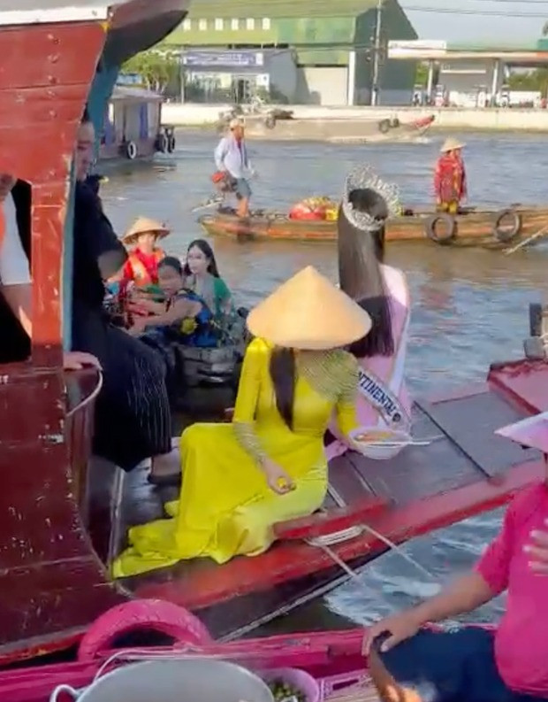 Hoa hậu Bảo Ngọc diện áo dài đi ghi hình ở chợ nổi nhưng cũng không cưỡng lại sức hút của đồ ăn, sẵn sàng "xả vai" để gọi ngay một bát bún thơm phức.