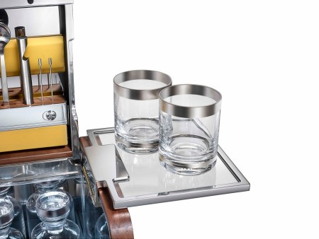 Quầy pha chế mini này được trau chuốt từng chi tiết nhỏ; từ giá từ treo dao gắn trên mặt gỗ, cho đến hệ thống đèn tự động, tất cả đều được các nghệ nhân chăm chút tỉ mỉ. Những chiếc ly thuỷ tinh viền bạch kim khiến các nghệ nhân mất một tháng mới làm xong.