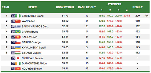 Chỉ cần Bình An thành công với một lần nâng, anh đã nắm chắc chiếc HC bạc. Người về nhì ở nội dung này, đô cử Trung Quốc Wang Jian, chỉ đạt mức tạ 170kg. HC đồng thuộc về lực sĩ Hy Lạp Bakochristoc với thành tích 162kg.