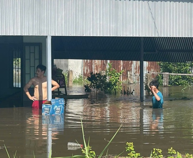 Đến chiều 29-8, nước tại khu vực ngập ở xã Hàm Mỹ chỉ rút một phần. Nhiều vườn thanh long vẫn bị ngập quá nửa trụ. Các hộ dân sinh sống tại thôn Phú Sơn, xã Hàm Mỹ vẫn bị nước tràn vào nhà.