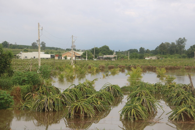 Ngoài đồ đạc, nhà cửa, hàng trăm hecta thanh long của nông dân xã Hàm Mỹ cũng bị thiệt hại nặng. Trong đó, nhiều vườn đang trong giai đoạn ra trái, chong đèn khi gặp mưa ngập kéo dài đều hư hỏng.