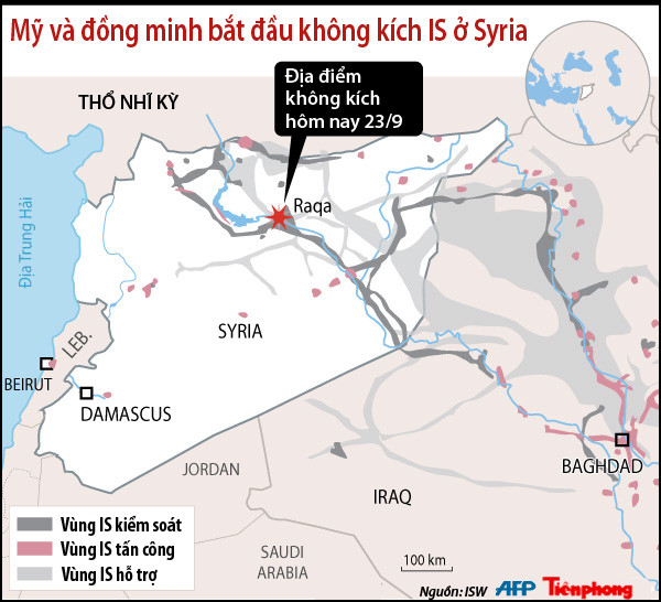 Đồ họa dưới đây cho thấy các vị chí chiếm đóng của IS và địa điểm không kích của Mỹ và đồng minh ngày 23/9.