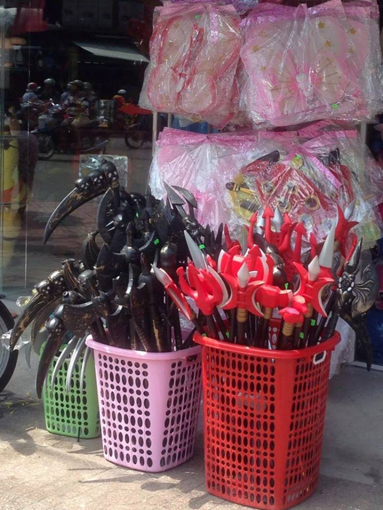Những loại đồ chơi bạo lực như đao, kiếm, búa... cũng được ưa chuộng. Đa số đều là hàng Trung Quốc. Tuy nhiên không ai quan tâm đến xuất xứ, món hàng càng quái, càng kinh dị càng đắt hàng...