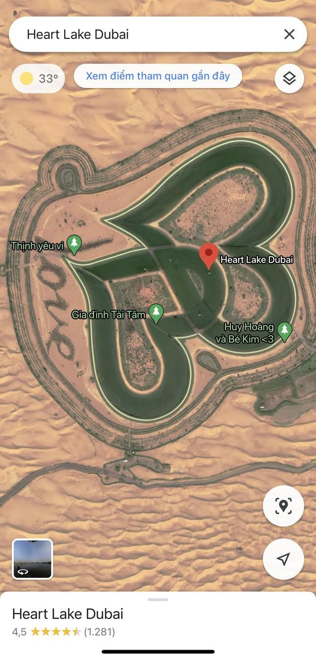 Trước đó, cư dân mạng Việt Nam từng làm náo loạn Google Maps khi tạo ra các địa điểm ảo xung quanh khu vực hồ Love Lake ở Dubai mục đích là để... "check-in".