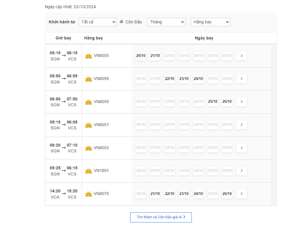Đặc biệt, đối với chặng bay Cần Thơ - Côn Đảo trong ngày 20/10 không có chuyến bay. Ngày 21/10 có duy nhất một chuyến, với giá vé dao động từ 2,7 triệu đồng/vé khứ hồi cho hạng ghế phổ thông tiết kiệm và gần 6 triệu đồng/vé khứ hồi với hạng ghế phổ thông đặc biệt linh hoạt.