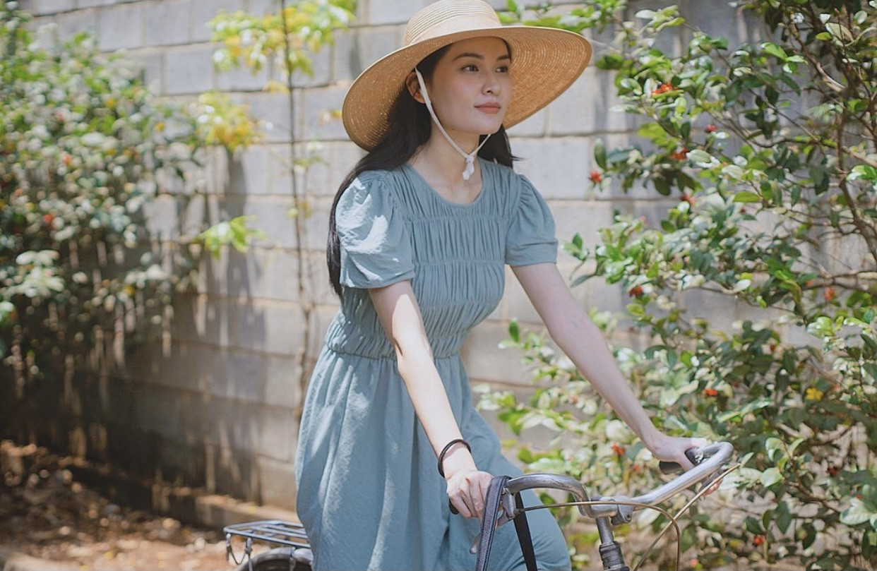 Á hậu Thuỳ Dung đẹp tựa 'nàng thơ' trong trẻo, thanh lịch với váy áo gam màu xanh pastel cùng chiếc xe đạp lãng mạn.