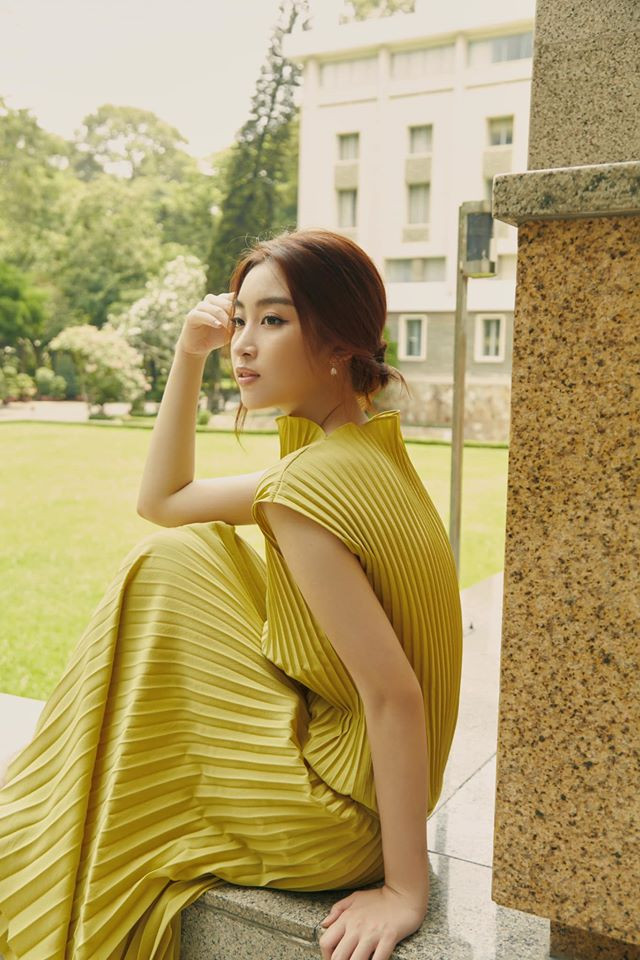 Diện bộ váy xếp ly độc đáo màu vàng có kiểu dáng thiết kế tinh tế, nhan sắc của Đỗ Mỹ Linh xinh đẹp thêm bội phần.