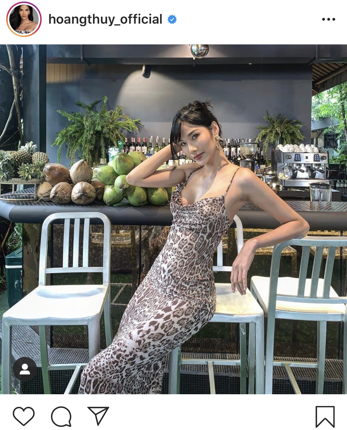 Trong khi đó Hoàng Thuỳ tiếp tục phát huy thế mạnh body gợi cảm của mình trong bộ váy da báo cắt xẻ gợi cảm.