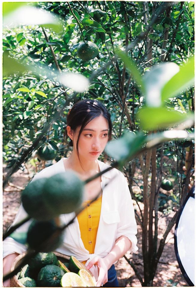 Hoa hậu Lương Thuỳ Linh dịu dàng nhưng vẫn không kém phần xinh đẹp trong vườn cam.