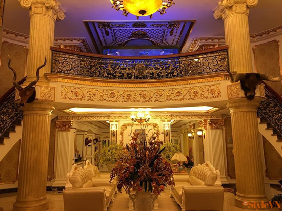 Kiến trúc bên trong ngôi nhà thiết kế theo phong cách hoàng gia. Từng chi tiết nhỏ đều hết sức tinh xảo. Phòng khách có quầy bar trưng bày bộ sưu tập rượu quý đắt tiền. Một số không gian tiện ích khác như phòng ăn, phòng ngủ… lại phủ sắc trắng theo gout châu Âu cổ điển. Nội thất đều là những vật dụng xa xỉ. Bộ bàn ghế mẹ chồng Hà Tăng dùng để tiếp đón khách đến nhà được cho là không dưới 200 triệu đồng.
