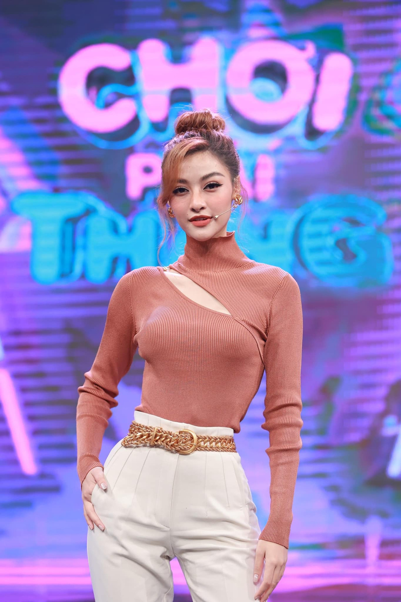 Á hậu Kiều Loan diện set đồ kín đáo nhưng vẫn không kém phần quyến rũ trên trường quay một gameshow.