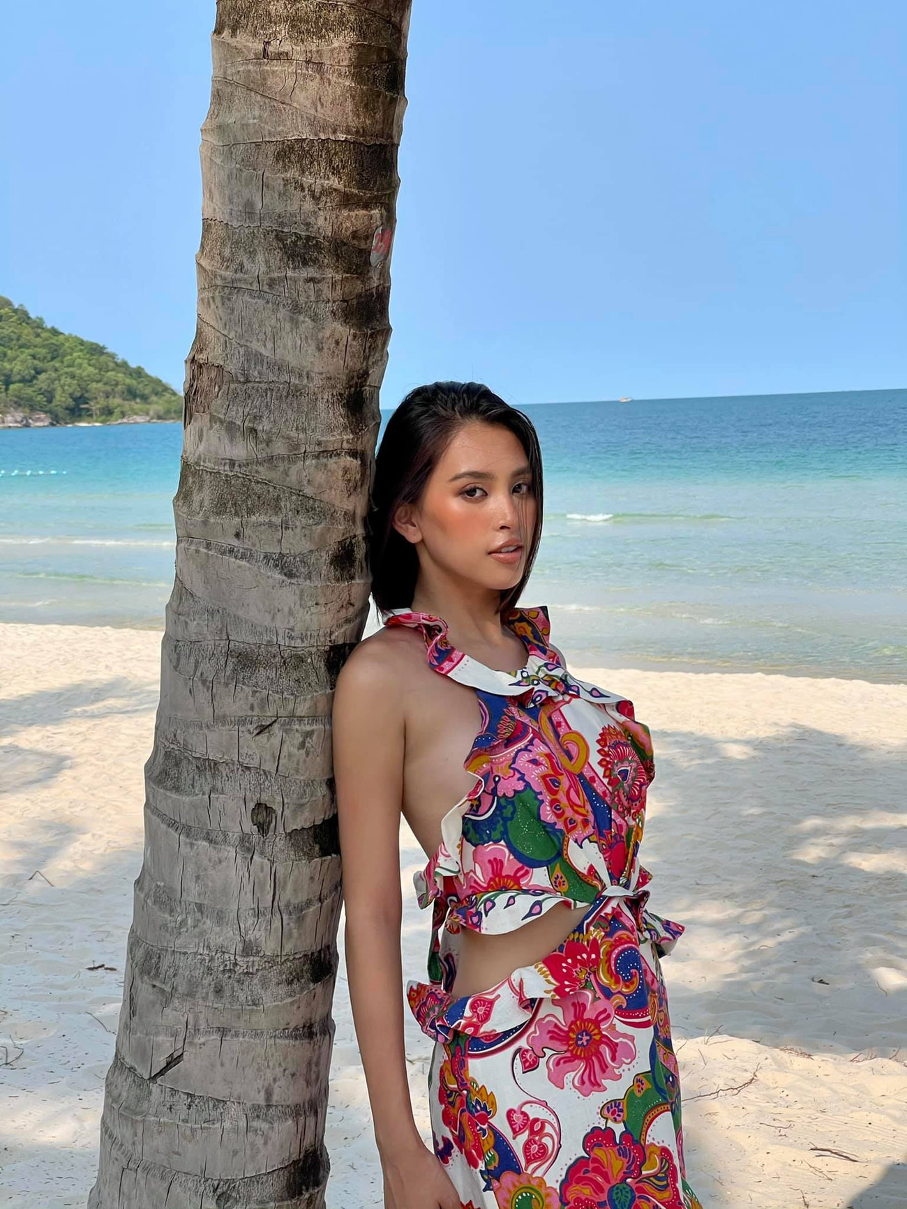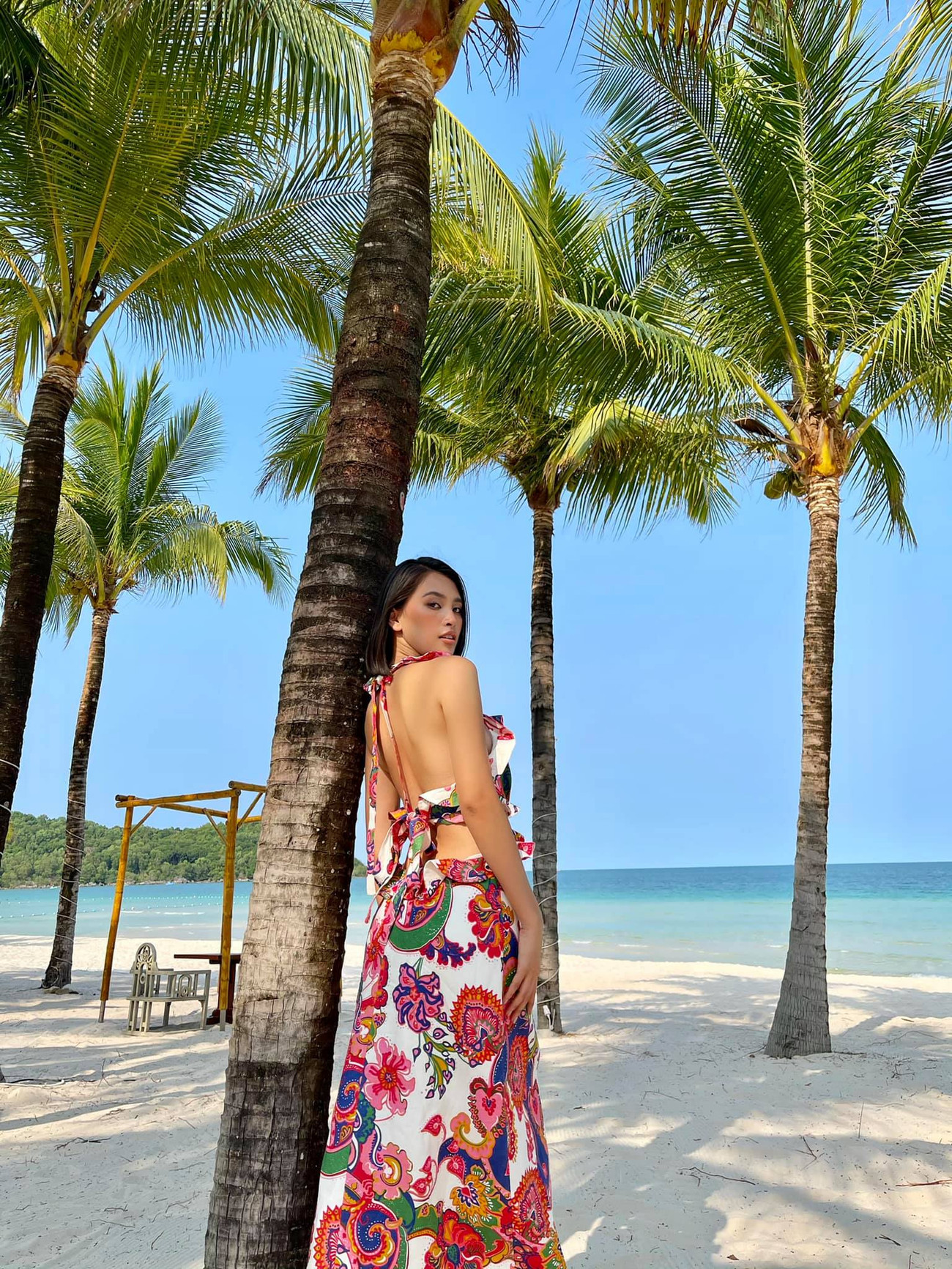 Hoa hậu Tiểu Vy diện váy hoa rực rỡ khoe dáng trên bãi biển cát trắng tuyệt đẹp ở Phú Quốc.