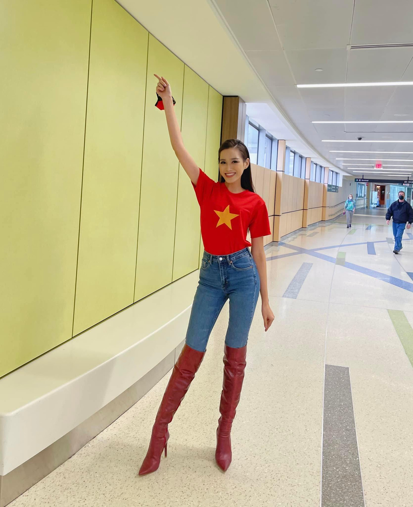 Có mặt ở sân bay Boston để chuẩn bị bay sang Puerto Rico, Đỗ Thị Hà diện trang phục áo cờ đỏ sao vàng 'nổi bần bật' khiến các fans Việt vô cùng tự hào và phấn khích.