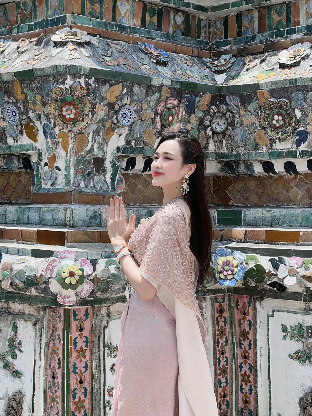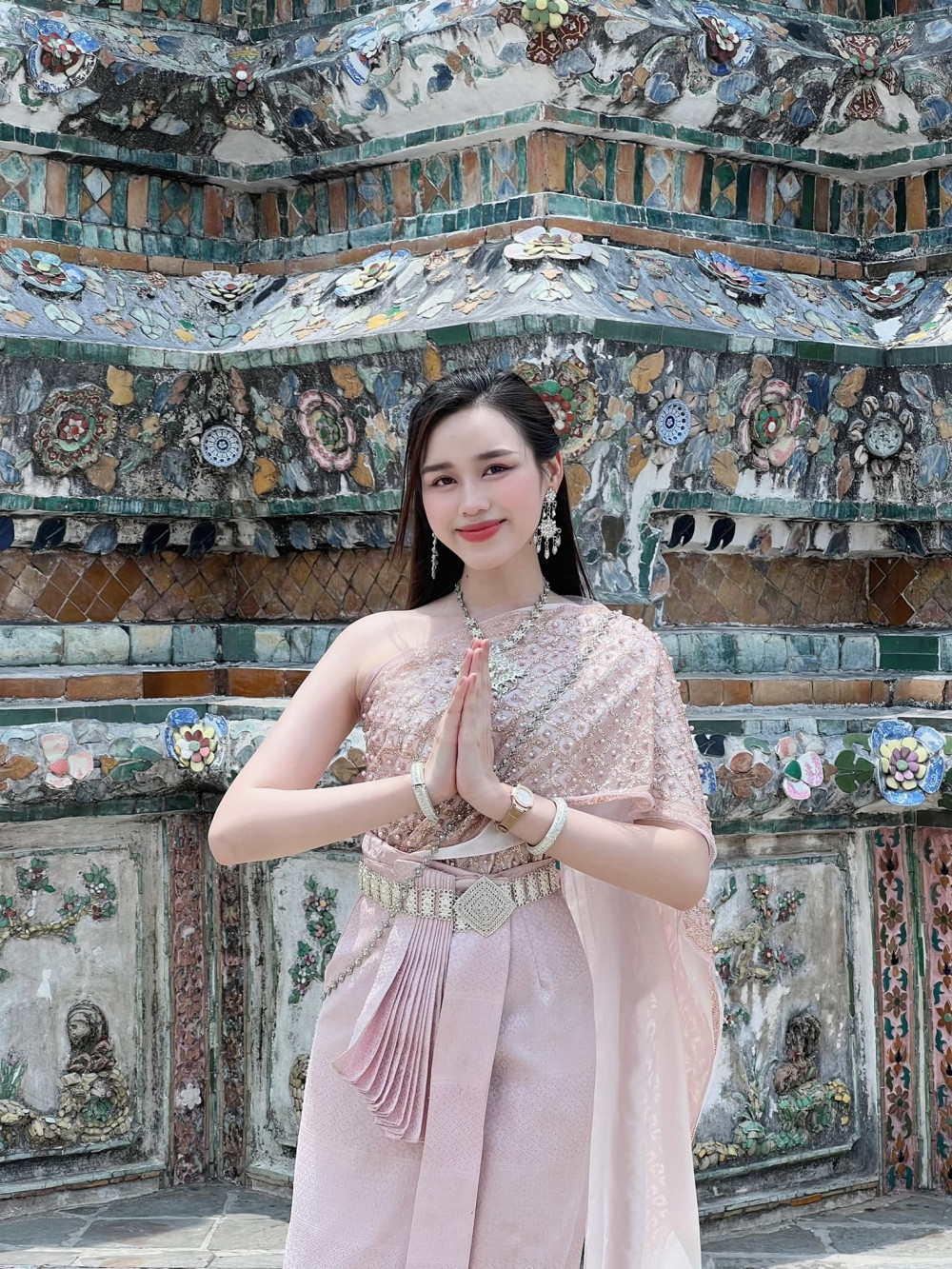 Mới đây trong chuyến du lịch Thái Lan, Hoa hậu Đỗ Thị Hà khoe nhan sắc xinh đẹp ngọt ngào trong bộ trang phục truyền thống Thái Lan màu hồng pastel.