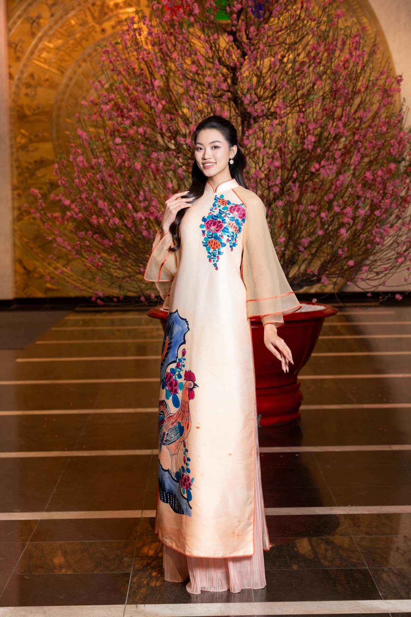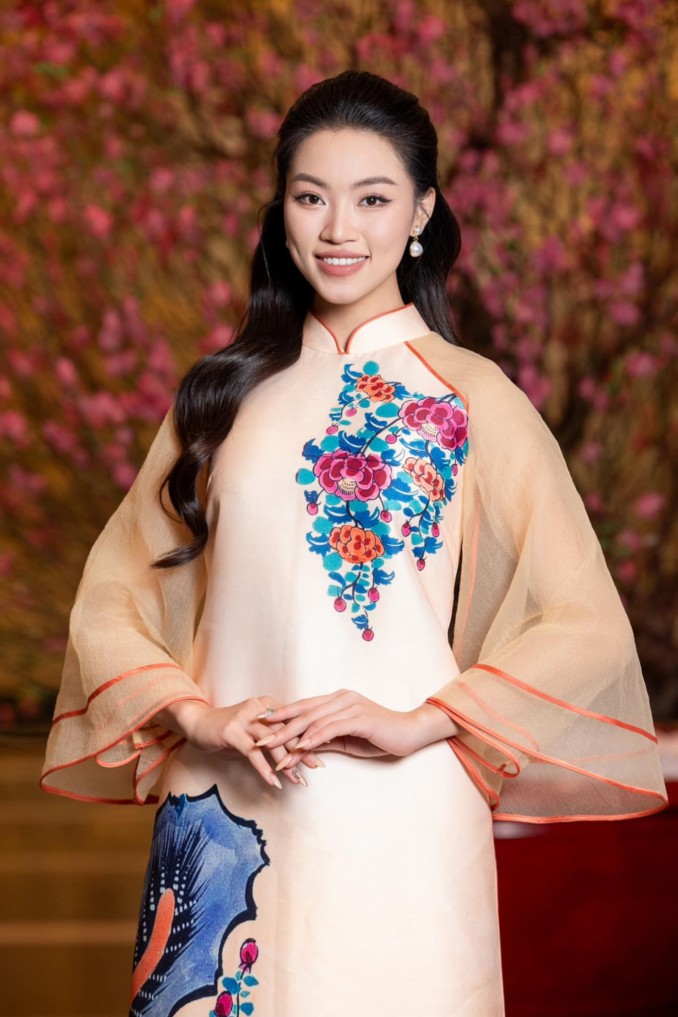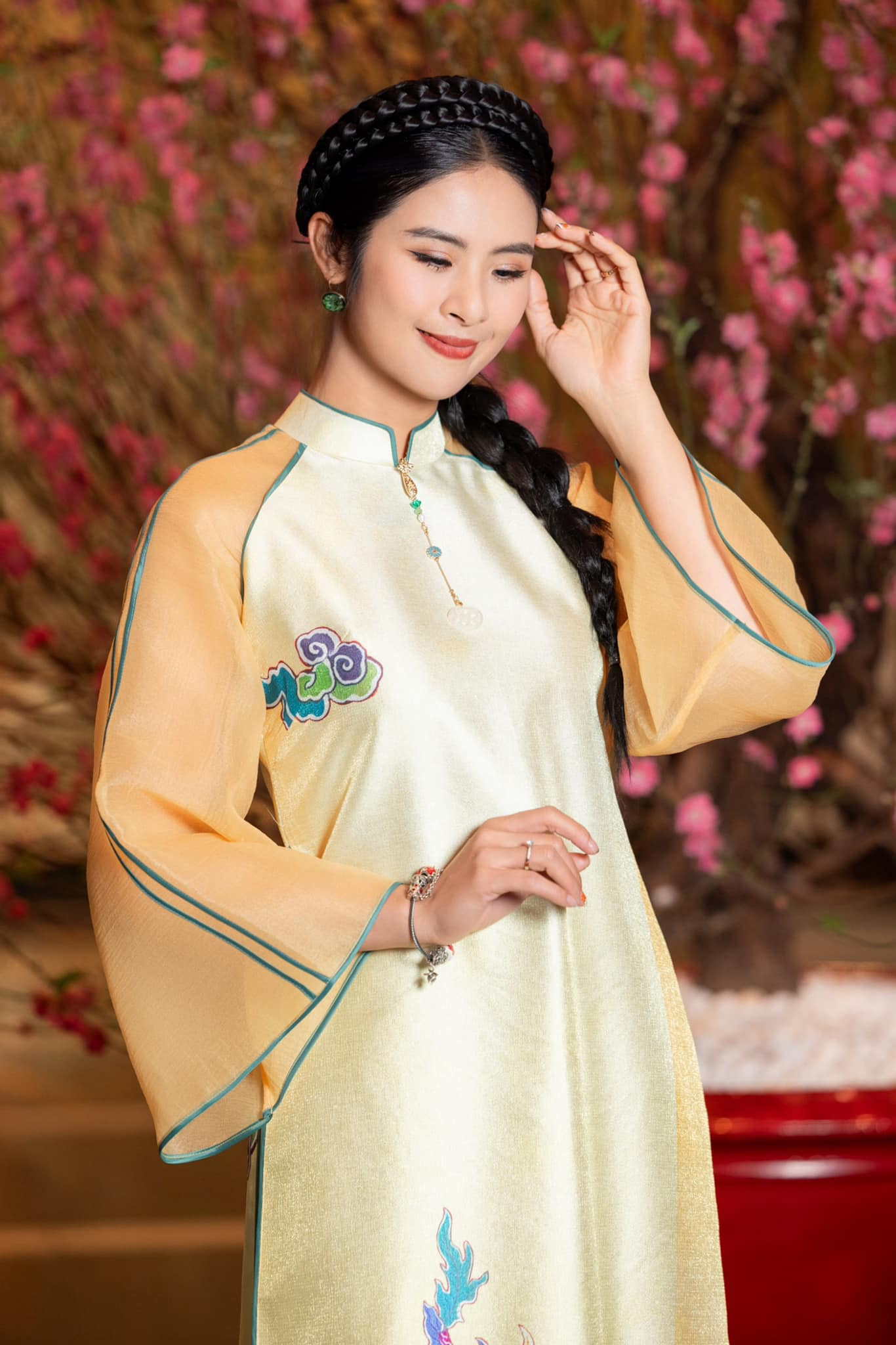 Nàng hậu nổi bật với nhan sắc trẻ trung, xinh đẹp dịu dàng. Bộ áo dài Hoa hậu Đỗ Thị Hà mặc là một thiết kế nằm trong loạt áo dài dành cho dịp Tết Nguyên đán Giáp Thìn 2024 của Hoa hậu Ngọc Hân.