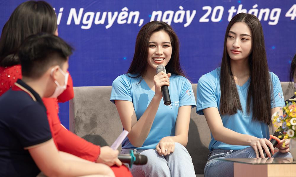 Khi đến thăm điểm trường 915 Gia Sàng, Lương Thùy Linh và Đỗ Thị Hà đã được tiếp đón nồng hậu từ các thầy cô và học sinh. Cả hai nhiệt tình giao lưu chụp hình và ký tên tặng các em. Không những thế hai nàng hậu còn được các fan nhí vẽ tranh tặng.