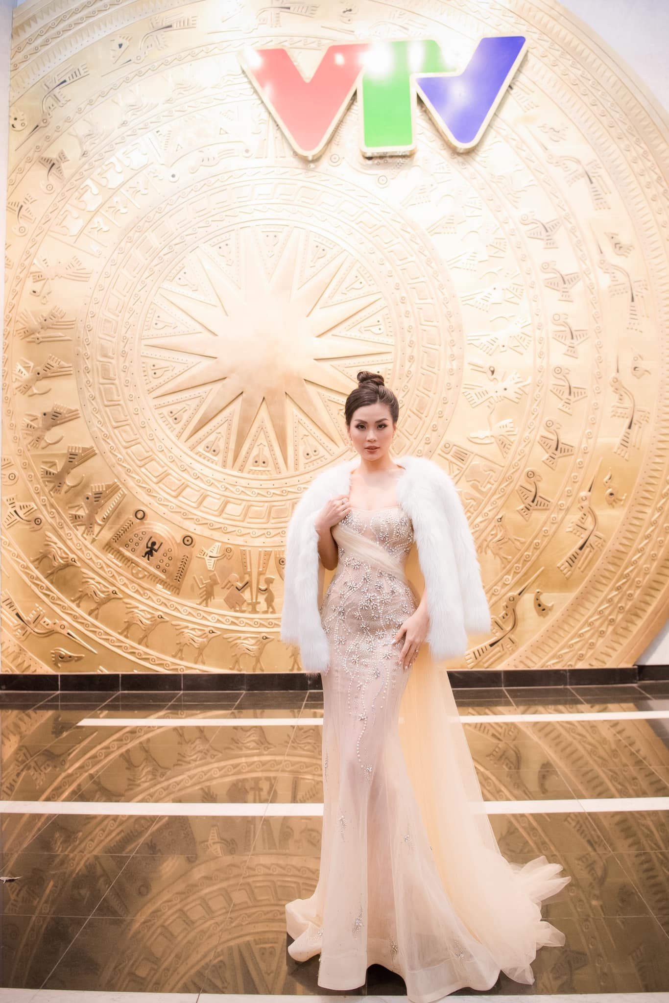 Á hậu Diễm Trang lộng lẫy và yêu kiều với bộ váy dạ hội tông màu nude tại VTV.
