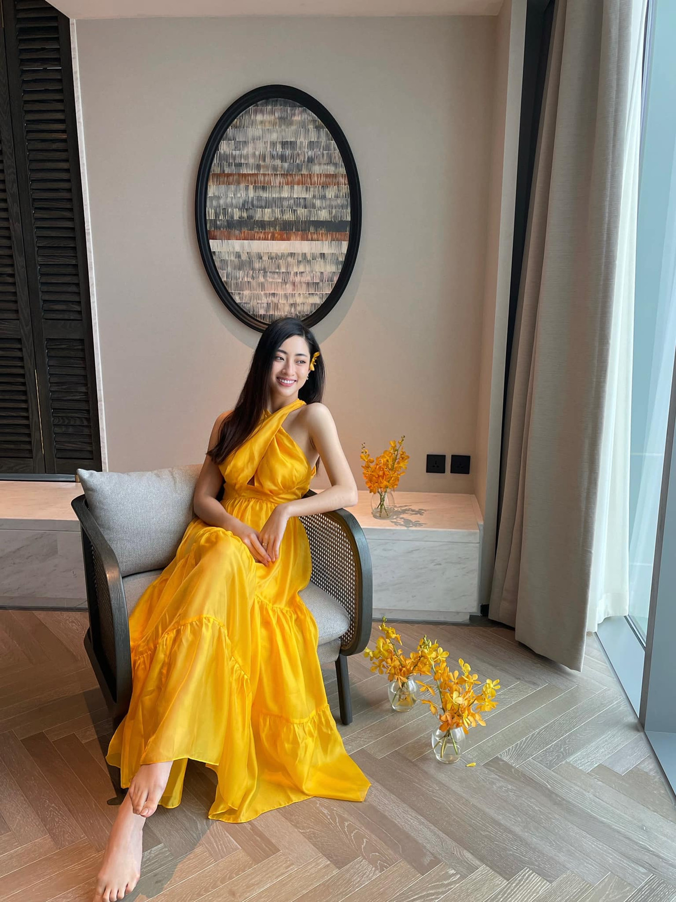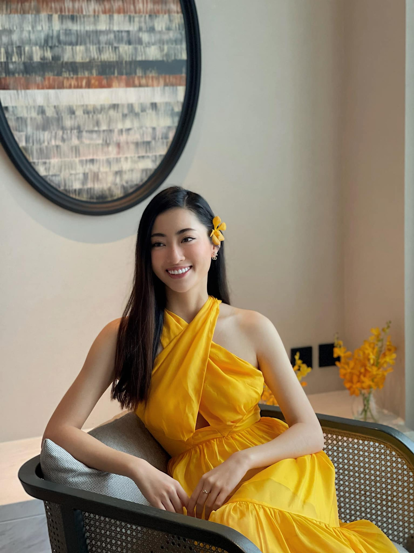 Hoa hậu Lương Thuỳ Linh hoá 'nàng thơ' xinh đẹp trong bộ váy gam màu vàng rực rỡ. Kiểu dáng váy giống váy yếm giúp người đẹp sinh năm 2000 khoe được vai trần gợi cảm.