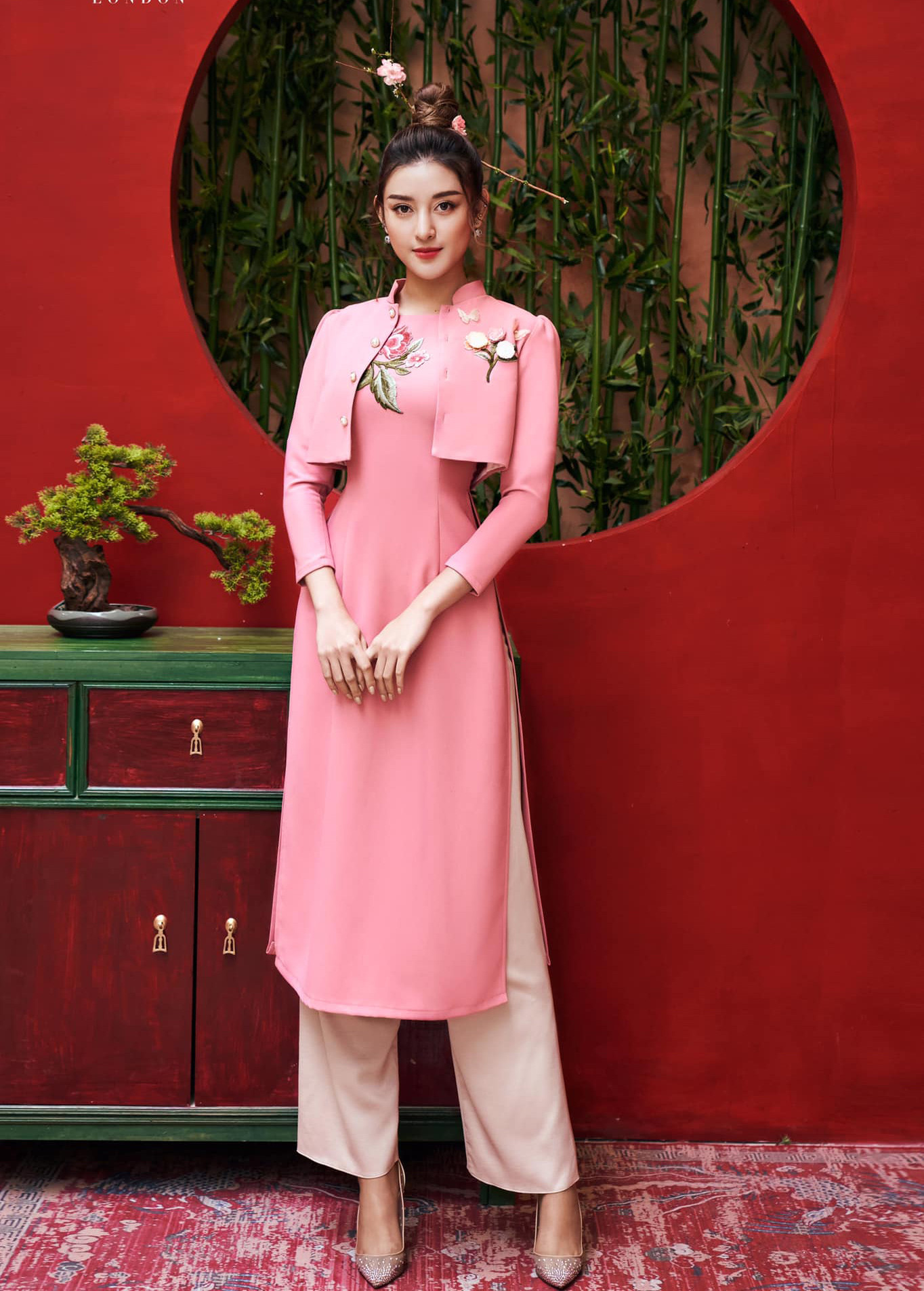 Những kiều áo dài lạ mắt đi kèm áo khoác thêu hoạ tiết cầu kỳ là gợi ý mới mẻ của Huyền My cho mùa áo dài cuối năm nay.