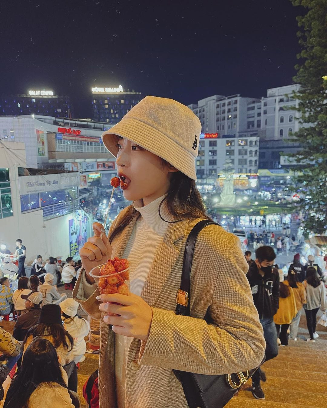 Hoa hậu Đỗ Mỹ Linh dịu dàng và duyên dáng khi thăm thú thành phố Đà Lạt về đêm.