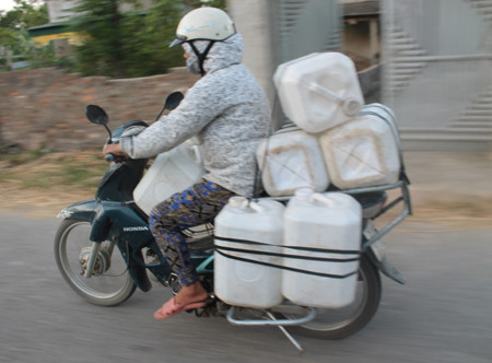 Người ta tận dụng tất cả vật dụng đựng nước, chất lên xe đạp, xe máy và cả xe kéo để chuyên chở nước về.